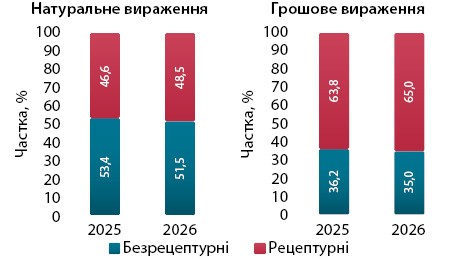 Рис. 6 Структура аптечного продажу лікарських засобів у розрізі рецептурного статусу у грошовому і натуральному вираженні за підсумками березня 2025–2026 рр.