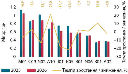 Рис. 2 Індикатори зміни обсягів аптечного продажу товарів «аптечного кошика» в грошовому вираженні за підсумками березня 2026 р. порівняно із аналогічним періодом попереднього року