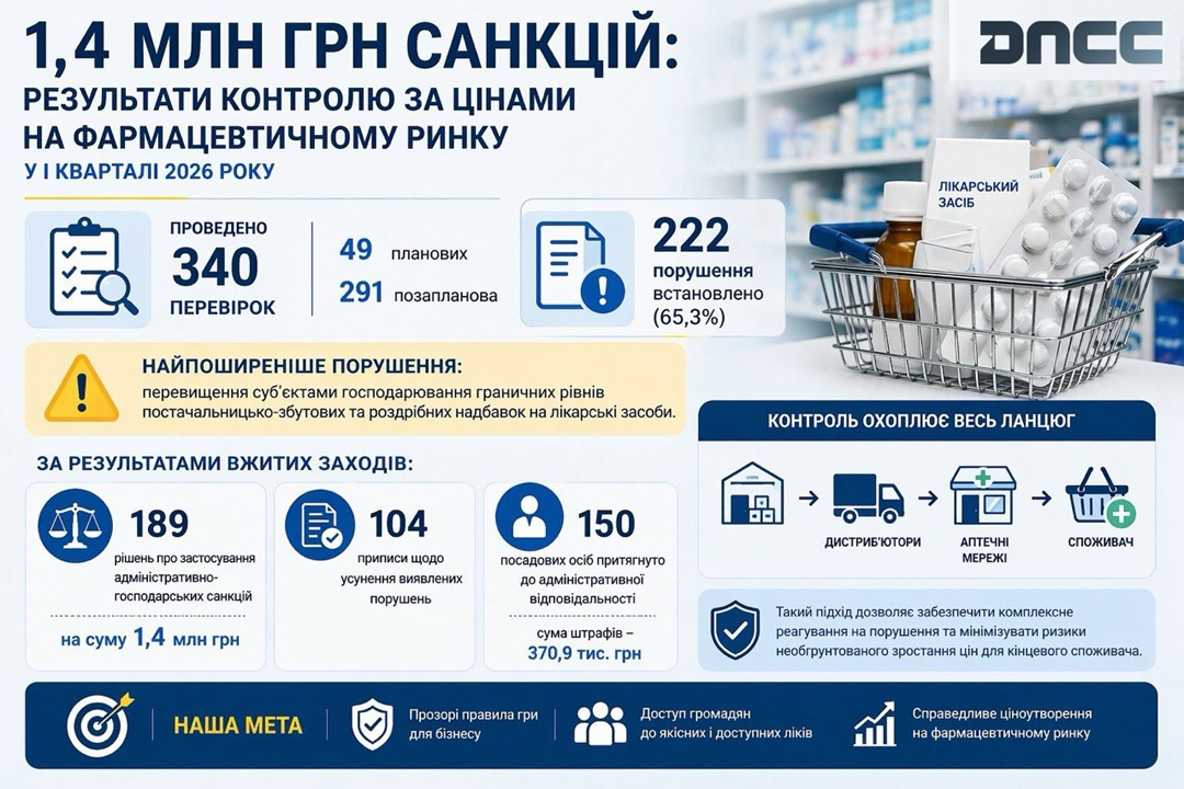За результатами І кв. 2026 р. проведено 340 перевірок, із них 49 планових та 291 позапланова. У 222 випадках (65,3%) встановлено порушення законодавства про ціни і ціноутворення.