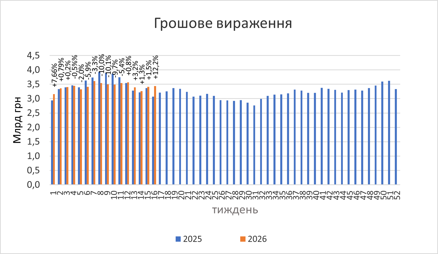 Рис. 1. Потижнева динаміка обсягів аптечного продажу лікарських засобів з 1-го тижня 2024 до 16-го тижня 2026 р.