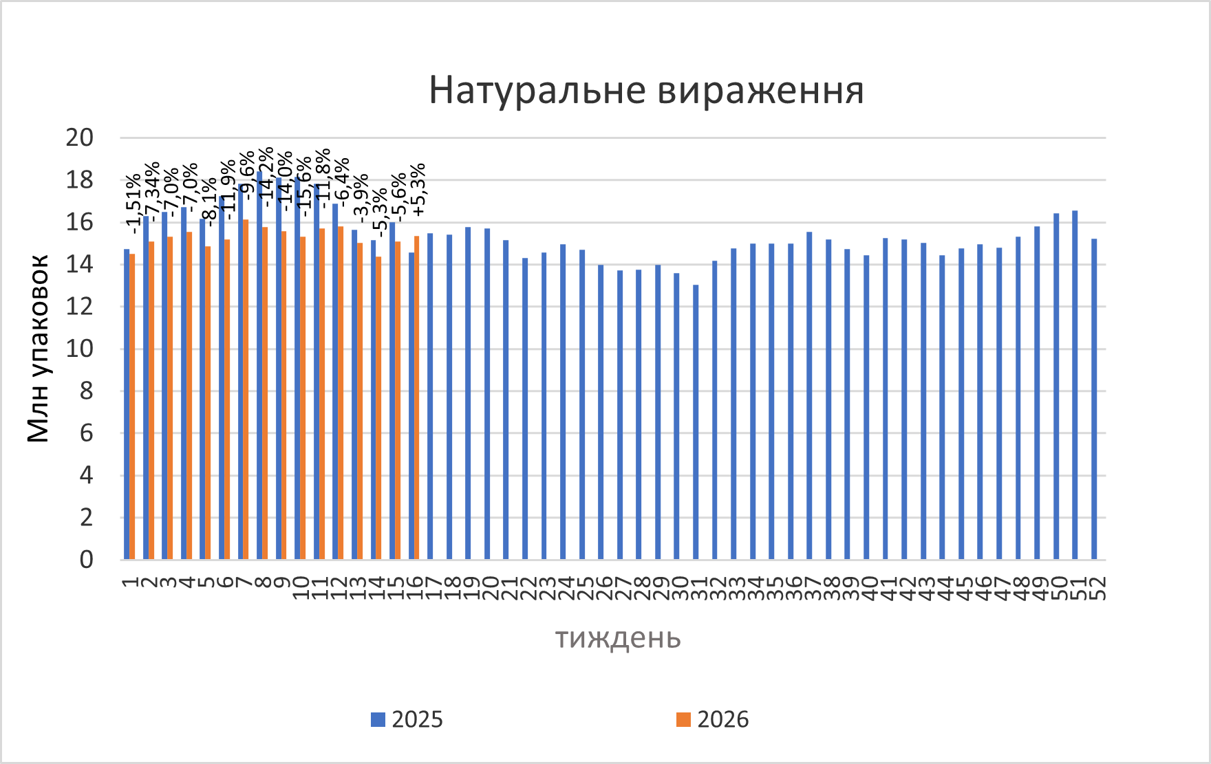 За підсумками 16-го тижня 2026 р. обсяги аптечного продажу лікарських засобів збільшилися на 122% у грошовому та на 5,3% у натуральному вираженні порівняно із показниками за аналогічний період минулого року (рис. 1). Показники розвитку суттєво покращилися порівняно із такими на попередньому тижні, коли вони становили +1,5% у грошовому та –5,6% у натуральному вираженні.