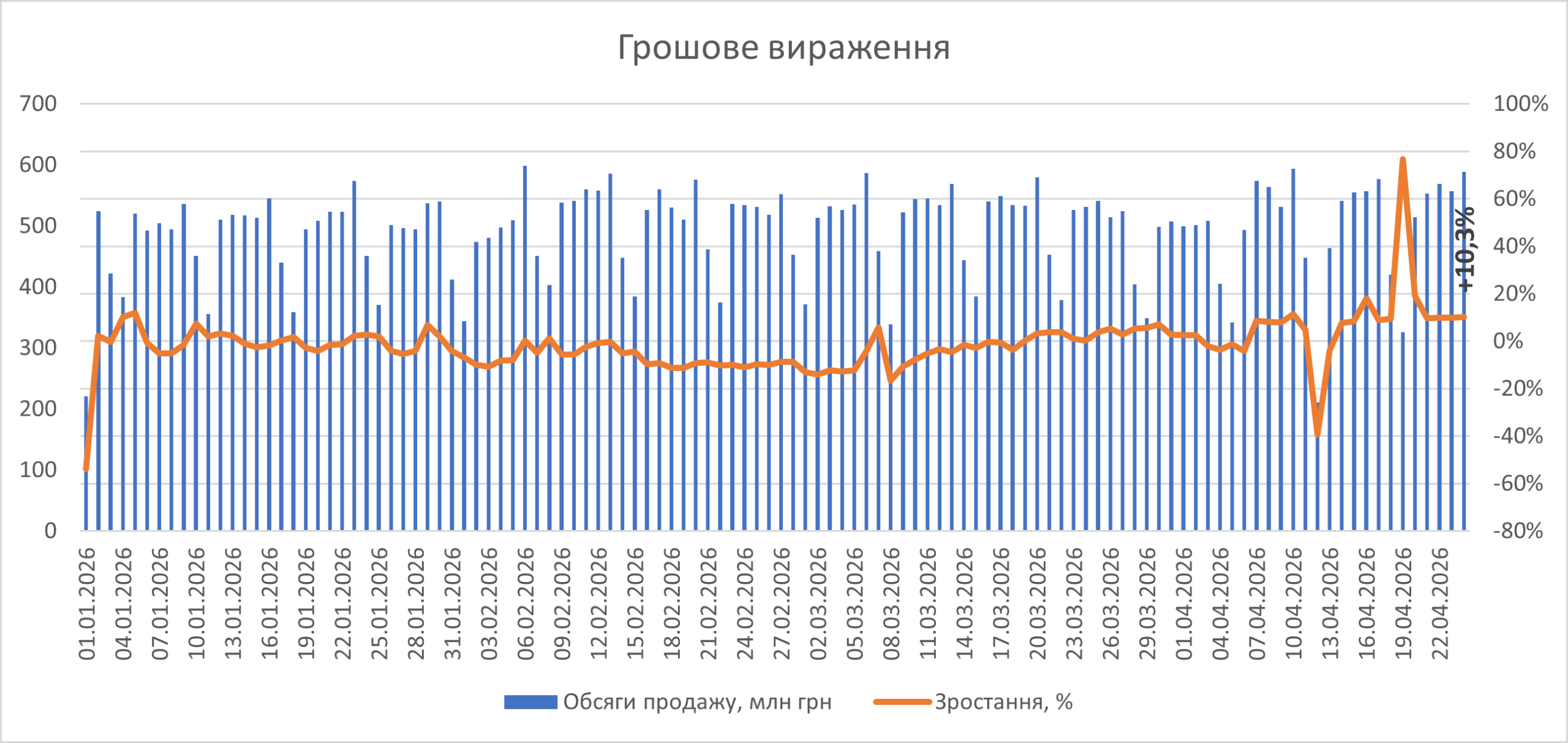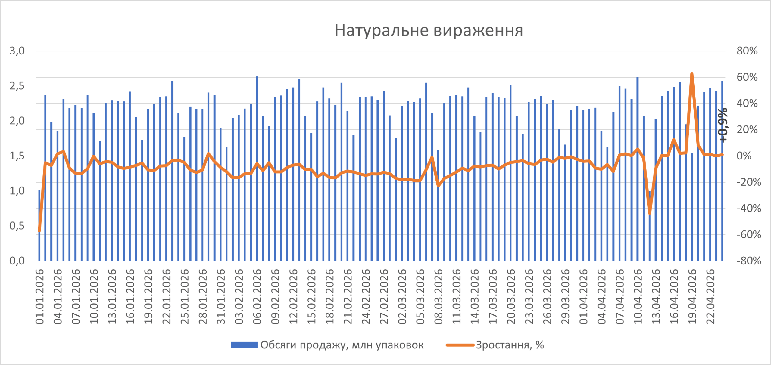 Рис. 2. Поденна динаміка обсягів аптечного продажу лікарських засобів з 1.01.2026 до 24.04.2026 р.