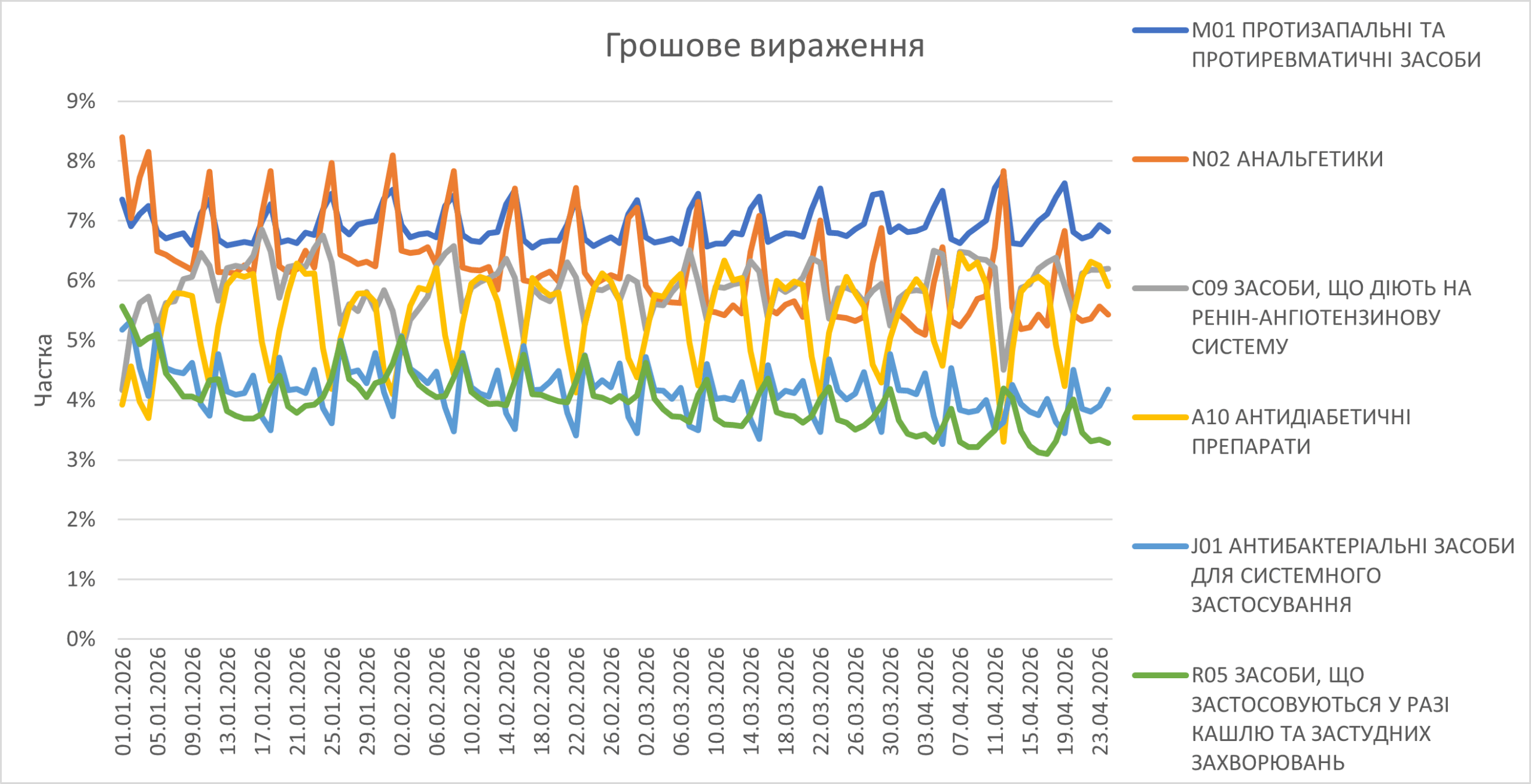 Рис. 3. Структура аптечного продажу лікарських засобів у розрізі груп АТС-класифікації 2-го рівня (топ-6)* у грошовому і натуральному вираженні з 1.01.2026 до 24.04.2026 р.