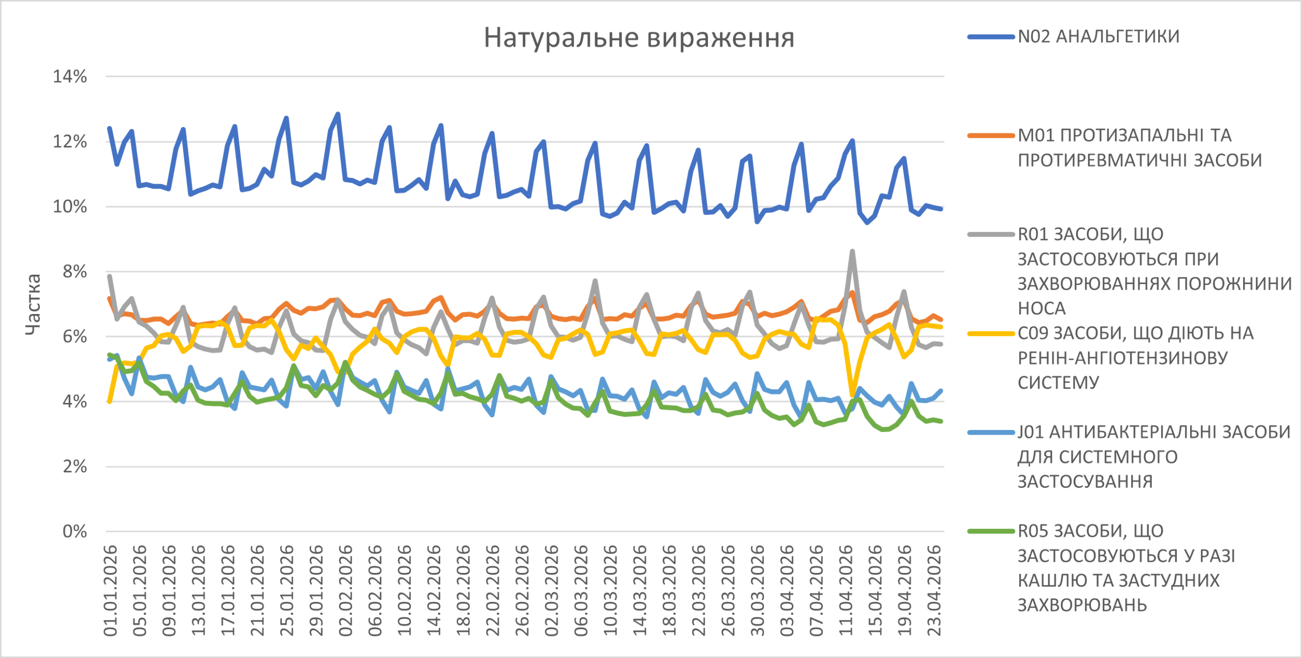 У розрізі груп АТС-класифікації 2-го рівня продовжується тенденція до зменшення частки анальгетиків у загальній структурі аптечного продажу ліків. Збільшення частки фіксується для антибіотиків (група J01) (рис. 3).