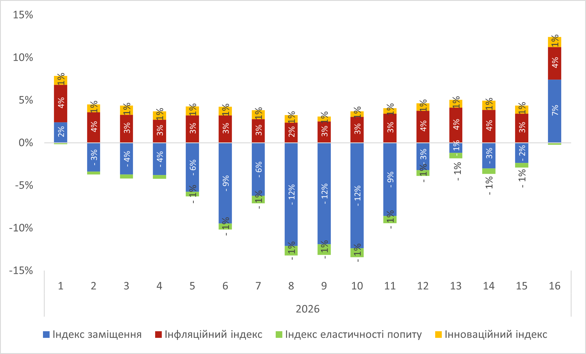Високі показники розвитку ринку на 16-му тижні зумовлені зростанням споживання в упаковках, про що свідчить позитивний показник індексу заміщення (+7%). Інфляційна складова, яка відображає зміну обсягів аптечного продажу лікарських засобів у грошовому вираженні за рахунок зміни ціни, на 16-му тижні 2026 р. становить 4% (рис. 4).