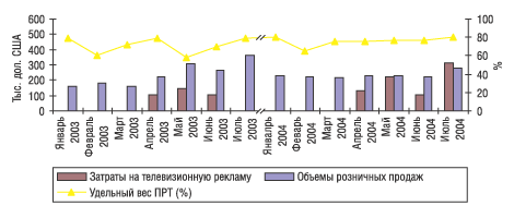Для лидера рейтинга торговых наименований препаратов по объемам рекламных бюджетов ПРОКТОЗАН компании Stada, относящегося к антигеммороидальным средствам (C05A X03) проведенная рекламная кампания позволила увеличить объемы продаж на 306%. Приведенные данные свидетельствуют о том, что производитель уделяет внимание каналам сбыта своего препарата (рис. 4), и можно предположить, что в данном случае повышение удельного веса ПРТ (с 6,8% до 29,5%) в июле 2004 г. вызвано преимущественно усилиями производителя, направленными на активизацию каналов сбыта. Повышение уровня удельного веса ПРТ до и во время рекламной кампании обеспечило улучшение доступа потребителя к рекламировавшемуся препарату. Не рекламировавшийся на телевидении в 2003 г. и в I полугодии 2004 г. препарат ПРОКТОЗАН в июле 2004 г. получил мощную рекламную поддержку одновременно на восьми каналах телевидения, анонсированную в «Еженедельнике АПТЕКА» (№ 24 (445), № 25 (446) и № 26 (447)), что вместе с канальной активностью способствовало резкому росту объемов продаж. Возможно, результаты июля 2004 г. являются лишь началом крупной рекламной кампании. Ответ на этот вопрос сможет дать лишь анализ последующих периодов.