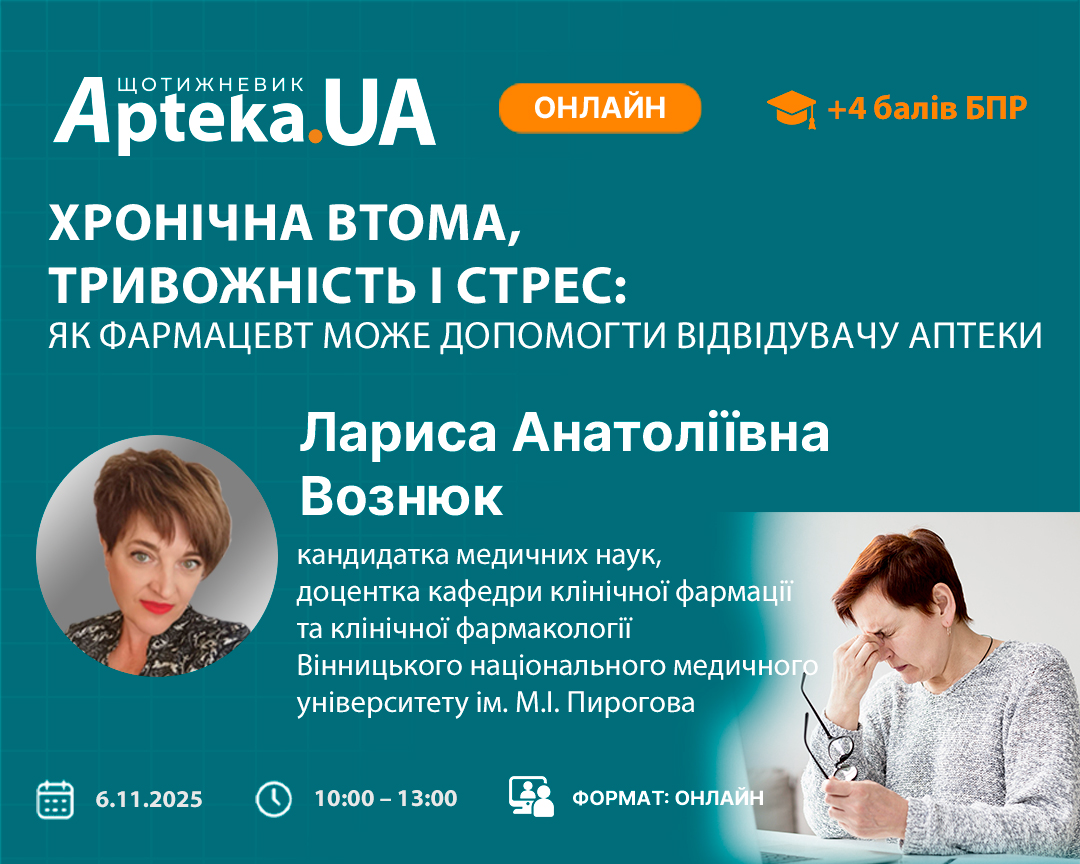 Сучасні рекомендації в межах доказової медицини, обґрунтовані практичні навички, рекомендації з досвіду — все це і навіть більше для тих, хто долучиться до фахового майстер-класу «Хронічна втома, тривожність і стрес: як фармацевт може допомогти відвідувачу аптеки», організованого провайдером безперервного професійного навчання (БПР) — виданням «Щотижневик АПТЕКА»